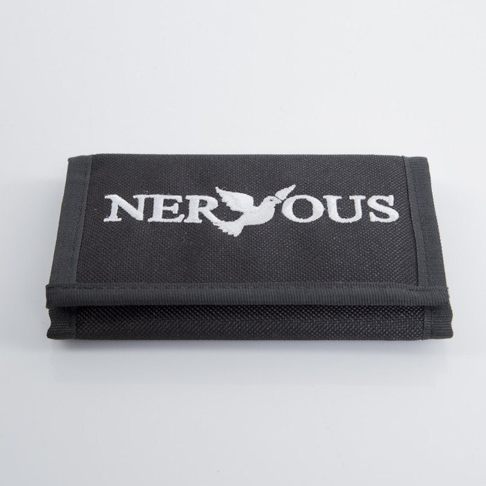 Portfel marki Nervous. Zaprojektowany i wykonany w stylu charakterystycznym dla marki. Dzięki licznym przegrodom, portfel jest pojemny i funkcjonalny. Wewnątrz przegrody na banknoty, karty płatnicze, dowód osobisty, prawo jazdy oraz zapinana suwakiem przegroda na monety. Portfel zapinany na rzep. Metalowe oczko do zaczepienia karabińczyka. Na froncie haftowana aplikacja Nervous.