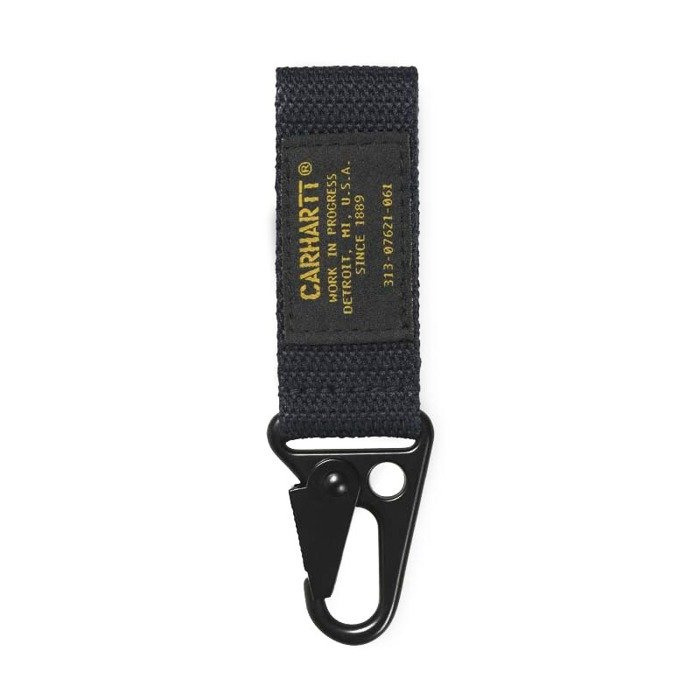 Brelok do mocowania kluczy marki Carhartt WIP. Wyposażony w karabińczyk z mocną sprężyną, pozwala w dwojaki sposób zamocować klucze: do paska lub szlufki. Składany element pleciony spięty solidnym rzepem i opatrzony brendową naszywką Carhartt WIP.