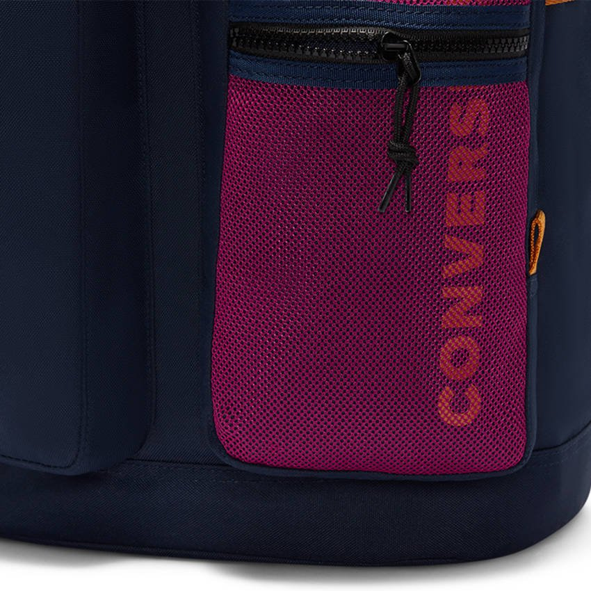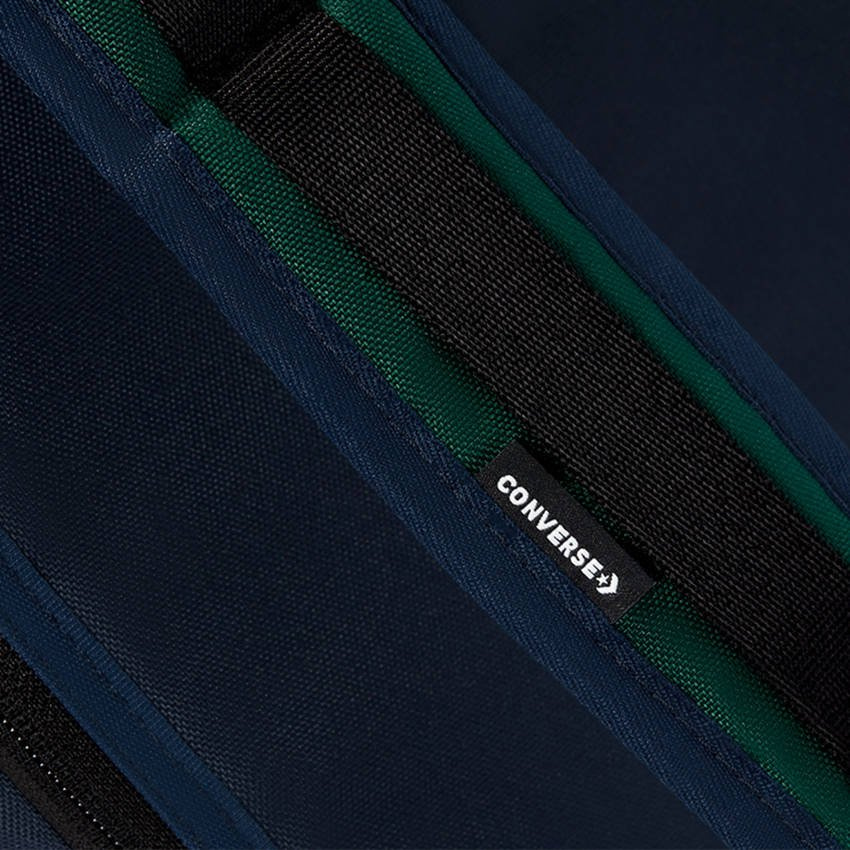 Plecak od marki Converse. Komora główna pakowana od góry, ściągana sznurkiem i zapinana klamrą. Wewnątrz przegródka na drobiazgi zapinana suwakiem. Na froncie kolejne kieszenie zapinane suwakiem. Boki ściągane paskami regulującymi co pozwala na dowolne formowanie. Wygodne szelki z możliwością regulacji. Na plecach dyskretna zapinana kieszonka. Uchwyt do przenoszenia w ręku. Brandowa aplikacja w formie wszywki.